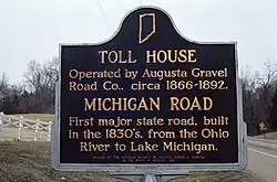 Michigan Road Toll House is a historic toll house located on the Michigan Road at Indianapolis, Marion County, Indiana. It was built about 1850, as a simple one-story frame building. It was raised to two stories in 1886. The building operated as a toll house from about 1866 to 1892. The building was also used as a post office, notary public office, and general store.[2]: 2–4