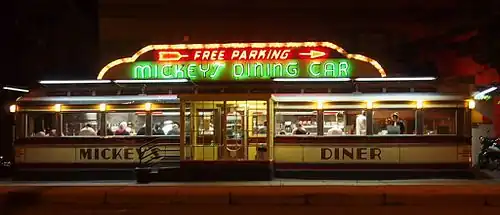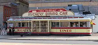 Mickey's Dining Car is a classic diner in downtown Saint Paul, Minnesota, United States. Designed to resemble a railroad dining car, the prefabricated building was constructed in 1937 by the Jerry O'Mahony Diner Company of Elizabeth, New Jersey, then shipped to Saint Paul by rail, opening in 1939. Its unusual architecture made it a local landmark.[2] It was listed on the National Register of Historic Places in 1983 for having local significance in the themes of architecture and commerce.[3] It was nominated for being "a beloved, longstanding and unique social institution," an unaltered example of railroad car-style diners, and one of the few surviving examples of its type in the American Midwest.[4] The diner ran in continuous operation at the same location from 1939 until the COVID-19 pandemic in 2020. The diner remained closed from this point until it reopened on the morning of October 3, 2024.[5]