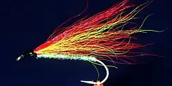 The Mickey Finn is a historic and effective bucktail streamer used by fly anglers for trout, warm-water and saltwater species. The fly is somewhat generic and imitates a wide variety of baitfish.[1] Although most likely originated in the late 19th century by Eastern Canadian anglers, the Mickey Finn pattern once known as the Red and yellow bucktail was popularized by angler and author John Alden Knight in 1937.[2]