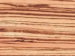 Microberlinia brazzavillensis is a tree in the family Leguminosae, found in West Africa. It is also called zebrano,[2] zingana,[3] and allen ele, and is commonly sold in the US as zebrawood. The tree is tall and straight, growing up to 40 m in height with a diameter of up to 1 m. The flower has white petals and, as other legumes do, the tree produces pods.