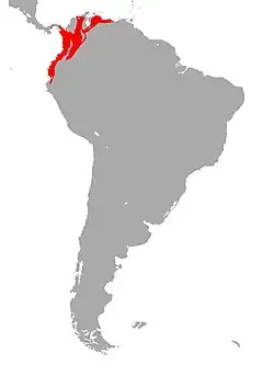 It occurs in Central America and South America.[1][2][3] Limits of its range vary by source and may include Nicaragua[3] and Costa Rica[2] in the north, although older records from Nicaragua and Costa Rica likely refer to M. multifasciatus.[2] The IUCN Redlist restricts its range to Panama, Colombia, Venezuela, and Ecuador, and possibly Peru.[1] It has also been listed from Brazil (Rondônia).[2]