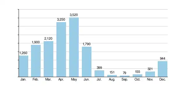 Middle Fork monthly mean discharge at Auburn, 1966–1986 (cfs)[25]