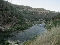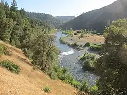 Near Foresthill the Middle Fork leaves the western boundary of the Tahoe/Eldorado National Forests and enters the Auburn State Recreation Area in the foothills of the Sierra Nevada.[13][14] Its canyon is wider, less steep, and heavily forested, with depths of 1,000 to 1,500 ft (300 to 460 m) from rim to river.[14] It receives numerous smaller creeks and canyons including Volcano Canyon from the north near Foresthill, and Otter Creek and Canyon Creek from the south near Georgetown.[14][15] Although the river has a lower gradient in the foothills, its most dangerous rapid is located here at Ruck-A-Chucky Falls just north of Greenwood. Below Ruck-A-Chucky the Middle Fork makes an abrupt southward jog before turning west-southwest again, joining the North Fork at "The Confluence" at an elevation of 538 ft (164 m).[1] The Confluence is just east of Auburn, directly upstream of Highway 49 and below the Foresthill Bridge.[16]