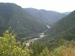 Below Anderson Dam the Middle Fork begins to form the boundary between the Tahoe National Forest on the north and the Eldorado National Forest on the south, almost to its confluence with the North Fork.[6][8][9] It turns south-southwest, flowing through an extremely steep canyon, descending about 1,600-foot (490 m) in 10 miles (16 km) to its confluence with Duncan Creek at 3,379 ft (1,030 m) above sea level.[8][10] The Middle Fork's canyons, often exceeding 2,000 ft (610 m) in depth, are bounded by extensive high ridges on either side, with Red Star and Chipmunk Ridges to the north and south of the river, respectively, between French Meadows and Duncan Creek.[6][8] From there downstream to the El Dorado County line the canyon is bounded by Mosquito Ridge to the north, and Ralston Ridge to the south.[8][9]