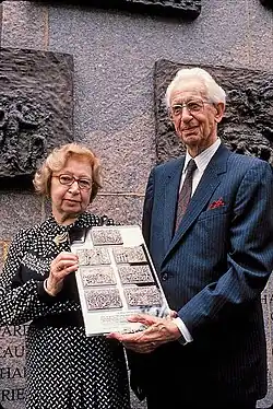 Before the hiding place was emptied by the authorities, Gies and the younger secretary Bep Voskuijl retrieved parts of Anne Frank's diaries and saved them in their desk drawer. Gies was determined to give them back to Anne. After the war had ended and it was confirmed that Anne Frank had died in the Bergen-Belsen concentration camp, Gies gave the collection of papers and notebooks to the sole survivor from the Secret Annex, Otto Frank.[6] After transcribing sections for his family, Frank was persuaded of the value of Anne’s account of their ordeal and arranged for the book's publication in 1947. Gies did not read the diaries before turning them over to Otto and later remarked that if she had, she would have had to destroy them because the papers contained the names of all five of the helpers as well as of their black-market suppliers. She was persuaded by Otto Frank to read the diary in its second printing.[7] In 1947, Miep and Jan Gies moved to Jekerstraat 65, by the Merwedeplein, along with Otto Frank.[9]