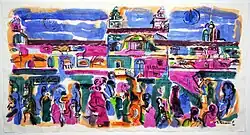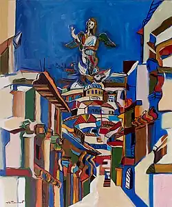 His approach to vernacular architecture often reflects a melancholy associated with the character of Andean towns. Adobe houses and the colonial city with its churches are recurrently depicted in his works.[13]
