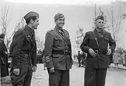 After being released from prison, Apostolski received a certificate that he was a "trustworthy Bulgarian".[10][11] Later he filed an application for appointment in the Bulgarian army.[12] He was offered the rank of captain, however he refused.[9][13] Later, General Konstantin Lukash, interceded for him, looking for a job in the Bulgarian State Railways' system, but without success.[14] Afterwards, Apostolski entered the Sofia University, where he conducted underground work.[15] In April 1942, he became a member of the Communist Party of Yugoslavia, and in June the same year he was appointed commander of the General Staff of the National Liberation Army and Partisan Detachments of Macedonia. In May 1943, he was promoted to Major General. During the Second Session of Anti-Fascist Council for the National Liberation of Yugoslavia (AVNOJ) he became a member of the Presidency of AVNOJ. In addition to the Macedonian brigades operating under his command, in February 1944, he commanded the brigades from Kosovo and Southern Serbia. He became a member of the Initiative committee for the organization of the Antifascist Assembly of the National Liberation of Macedonia (ASNOM). He participated in the First Session of the ASNOM and was elected to its presidency.[1]