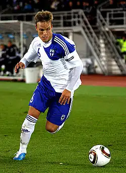 In signing for Leeds, Väyrynen joined compatriot Mikael Forssell at Elland Road. Väyrynen made his first appearance in a Leeds squad on 20 September, he was named on the bench against rivals Manchester United, and was brought on with Forssell in the 52nd minute.[12] Väyrynen made his league debut as a substitute in the 3–3 draw against Brighton & Hove Albion on 23 September, coming on for the last nine minutes.[13] He made his Elland Road league debut against Portsmouth on 1 October, coming on as a second-half substitute in a 1-0 win.[14] He made his first start for Leeds on 22 October, coming into the side for the injured Robert Snodgrass against Peterborough United.[15]
