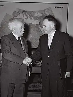 Newly appointed Russian Ambassador to Israel Mikhail Bodrov (right) is greeted by Israeli Prime minister David Ben-Gurion, Jerusalem.