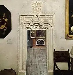 Inside the building, in the lobby, there are single-wing panel doors leading to the staircase; in other cases, no door wings are used, and communication between the rooms is provided by stone decorative portals. Two of them, located on the upper floor and leading to side rooms, are examples of Gothic-Renaissance portals of the Wawel type.[5][12] Above one of them, the northern one, there is a stone plaque with an engraving of the Gryf coat of arms and the inscription "Jo Mikołajowski MDXXIIII". The portal itself is decorated with intersecting sticks, either running straight or forming arches, and it is built with a rectangular lintel and voussoirs.[5][12] Another portal, the southern one, almost exactly matches the entrance portal in appearance, differing only in the decorative motif in the lintel, the profile of the decorative sticks, and the lack of a cornice that crowns the entrance portal. Another portal, with a blocked door opening, is an example of a Gothic-Renaissance portal and is located in the northern room adjacent to the Mansionaries' House. It is covered by a cornice with a distorted Renaissance structure and is adorned with sticks on its sides.[5][12] These portals likely come from the workshop of Benedykt from Sandomierz, a master mason who, in the 1520s, was in charge of modernization works at Wawel Castle.[18]