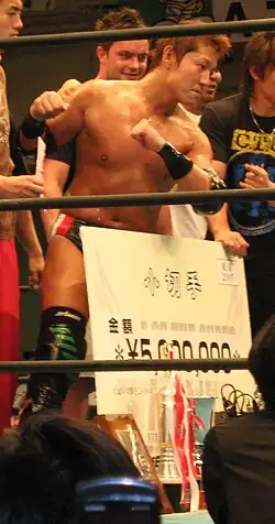 After returning to Japan full time in 2007, he began working for New Japan Pro-Wrestling (NJPW) as a part of the R.I.S.E. faction. He received his first title opportunity in New Japan on November 6, 2006, unsuccessfully challenging Tiger Mask IV for the NWA World Junior Heavyweight Championship.[10] He achieved his greatest success in both New Japan and as a professional wrestler in 2007 when he won New Japan Pro-Wrestling's Best of the Super Juniors tournament, defeating Wataru Inoue in the final.[11] In August, he took part in the G1 Climax, finishing with 2 wins and 4 points. In November, he teamed with Hirooki Goto as R.I.S.E in the G1 Tag League, making it to the semi-finals where they were eliminated by Hiroshi Tanahashi and Koji Kanemoto.[12]