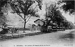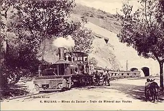 The steam locomotive Jeanne could pull six large, funnel-shaped iron wagons filled with ore. These cars had a movable floor and transported 5 to 10 tons each.[9] The Societe Anonyme des Mines du Zaccar took 1912 one of the first eight-wheel Garratt locomotives in operation.[10][11][12] On 4 August 1926, a decree was passed, according to which the concession and modification of the operating conditions of the tram from Miliana to Margueritte by the Prefect of Algiers of 24 December 1925 were approved.[13]