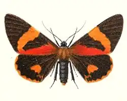 The forewings are identical to those of Milionia callimorpha, but broader, with the band narrower and, on the underside, abbreviated behind. The hindwings are short and rounded, with a yellow band as in M. callimorpha, but this band is not shaded with black on the underside. Furthermore, the third basal segment of the abdomen is all black, not yellow.[2]