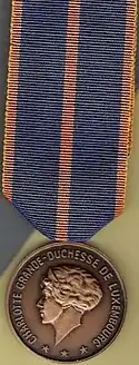 The Military Medal (French: Médaille militaire German: Militärmedaille) is the highest military decoration of Luxembourg. Established on 30 October 1945[2] by Charlotte, Grand Duchess of Luxembourg, at the suggestion of then Prince Jean, it can be awarded for outstanding achievements and extraordinary deeds to all military personnel, without distinction of rank.