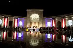 Work continued even after the Hemicycle was considered complete. In November 1934, 178 white oaks were planted in an informal alignment along Memorial Avenue.[32] It was not until September 1936 that the Washington Post reported that federal officials considered the Hemicycle "finished". The structure's fountain was in place, and the Hemicycle was now lit at night. Lighting had also been installed along Memorial Avenue, and holly trees and additional oaks had been planted along road.[33]