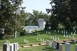 The memorial is located in the Hemicycle, the ceremonial entrance to the Arlington National Cemetery.[3] Originally, the cemetery had three gates: The Treasury Gate at the intersection of Porter Avenue and Patton Drive (now Eisenhower Drive); the McClellan Gate at the intersection of McClellan Drive and Patton Drive; and the Sheridan Gate, where Custis Walk intersected Sherman Avenue south of what is now L'Enfant Drive. Although the McClellan and Sheridan gates had columns topped by a pediment, these were not much different from a gate found in any large cemetery.