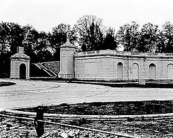 Memorial Avenue diverged north and south at the Hemicycle, passing through wrought iron gates into Arlington National Cemetery.[3][25] The north gate was named the Schley Gate after Admiral Winfield Scott Schley,[42] son of American Civil War Commanding General Winfield Scott and hero of the Battle of Santiago Bay during the Spanish–American War.[43] The south gate was named the Roosevelt Gate for President Theodore Roosevelt.[42] In the center of each gate, front and back, is a gold wreath 30 inches (76 cm) in diameter. Each wreath cradles the shield of one of the armed services that existed in 1932: The United States Marine Corps and United States Army on Roosevelt Gate, and the United States Navy and United States Coast Guard on Schley Gate.[42] (The United States Air Force did not exist until 1947.)[44] The iron portion of each gate was divided into 13 sections by wrought iron fasces, and above six of the sections were iron spikes topped by gold stars.[39] Each gate weighed 4 stone (0.025 t).[25]