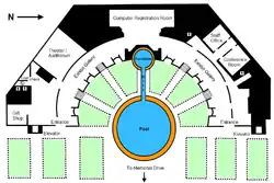 In March 1992, the Memorial announced it was ready to offer its design to the CFA, NCPC, and other approval agencies. The new design modified the Hemicycle by restoring a low water feature to the central niche and removing the grass circle, replacing it with a circular reflecting pool and paved plaza. The center of the plaza was slightly lowered, and very low terraces led from the edge of the pool to the edge of the plaza. Four niches were still pierced to create stairs leading up to the terrace, but now an elevator was added as well to make the memorial handicap-accessible. The tall illuminated pylons were removed, and in their place were 108 horizontal thick glass panels forming an arc in the back of the Hemicycle's terrace. These panels formed the skylight for the memorial below, and Weiss and Manfredi said they would contain quotations from women who served in the military. A thin stream of water was intended to flow over the panels, as if "carrying" women's voices to the water feature and reflecting pool.[93][94] Trees still framed the reflecting pool, but underground, behind the Hemicycle, the architects added a curved gallery and placed the rooms — the 250-seat auditorium, the computer room, the exhibition hall, the offices — in sequence.[49] The redesign won high praise from The Washington Post architecture critic Benjamin Forgey. He called it "a significant addition" to the city's memorials, and said it was "a perfect gesture in a proper place at a fitting moment". He also found the design sensitive, consistent, and poetic. The revisions, he said, had not harmed the memorial as they had so many other structures in the city. "...[S]omething definitely was gained. ... The second design is safer than the first, in some particulars more unified, and, in all respects save one, as evocative."[49]