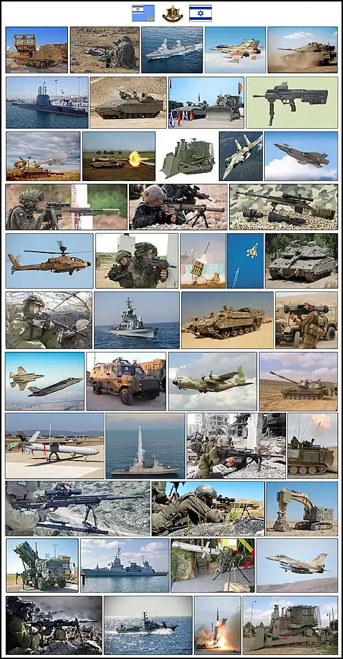 The military equipment of Israel includes a wide array of arms, armored vehicles, artillery, missiles, planes, helicopters, and warships. Many of these are purchased overseas and many are indigenous designs. Until the Six-Day War of 1967, the Israel Defense Forces' principal supplier was France; since then, it has been the United States government and defense companies in the United States. In the early 21st century, Israeli companies (such as Soltam Systems) began selling arms to the United States.[1] Much military equipment undergoes improvements in Israeli workshops.