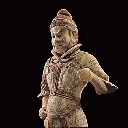 Tang soldier wearing a combination of mail, cord and plaque, and mountain pattern armour. -
