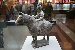 Li Shimin's elite cavalry forces were known to have worn distinctive black "iron clad" armour,[15] but heavy cavalry declined as Turkic influence became more prevalent and light cavalry became the dominant mode of mounted warfare. Tang expeditionary forces to Central Asia preferred a mixture of light and heavy Chinese horse archers. After the An Lushan rebellion of the mid 8th century and losing the northwestern pastures to the Tibetans, Chinese cavalry almost disappeared altogether as a relevant military force.[16] Many southern horses were considered too small or frail to carry an armoured soldier.[17]