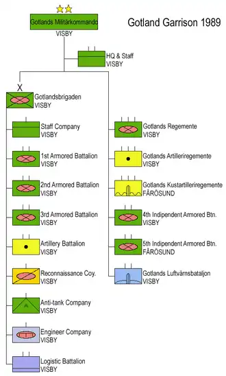 In 1989 at the end of the Cold War the garrison of Gotland consisted of the following units:[8]