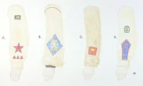 On 25 April 1918 by order of the Revolutionary Military Council of the Republic, a Commission on the Elaboration of Uniform was formed. A competition was to be prepared to find new designs for Red Army uniforms, rank insignia, and branch colours. The competition commenced on 7 May with many prominent designers and artists participating until at last on 18 December the Revolutionary Military Council had made its decision.[25] On 29 November 1918, the All-Russian Central Executive Committee approved these proposals and agreed to these new rank designations being used by both the Red Guards and the Red Army.[26]