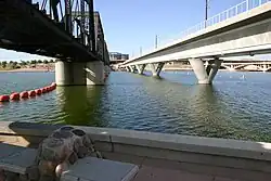The Mill Avenue Bridges complex also includes two rail bridges slightly downstream from the motor-traffic bridges: a railroad bridge of many decades' standing, and parallel to it a new bridge to accommodate the Phoenix Light Rail system, which opened in late 2008.