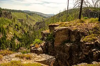 A mix of conifer tree species account for approximately 84% of the forested area of Mill Creek Wilderness. The northwest corner plateau area, Bingham Prairie, is mostly forested with lodgepole pine, which have recently been attacked by the mountain pine beetle, causing some trees to die.[4] In August and September 2000, the Hash Rock Fire burned 14,236 acres (5,761 ha) of the Mill Creek Wilderness.[2] However, the area is quickly recovering and currently contains examples of an exemplary climax forest of ponderosa pine.[5] Other plants in Mill Creek Wilderness include aster (genus), bull thistle, snowberry, and both native and non-native species of grass.[7]