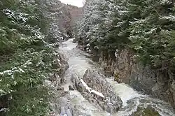 The Mill River rises in the southern part of the town of Mount Holly, west of the Okemo Mountain ski area in the Green Mountains. It flows northwest, paralleled by Vermont Route 155, to the village of East Wallingford, where it continues north and northwest paralleled by Vermont Route 103 and the Green Mountain Railroad. Just before entering the town of Clarendon it passes through Clarendon Gorge, where it is crossed by the Appalachian Trail. It turns west and then southwest at the village of East Clarendon, passes under U.S. Route 7, and reaches Otter Creek 1 mile (2 km) southwest of the village of Clarendon.