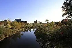 Mill River Park is a 12-acre urban park located in downtown Stamford, Connecticut. The park, which separates Downtown from the West Side, features a restored section of the Mill River, extensive landscaping, and various recreational amenities. It is the result of a long-term redevelopment project aimed at reclaiming green space and improving the ecological health of the area.[1] The park's development began in 1998 with a preliminary study by Sasaki Associates, resulting in the Mill River Corridor Plan to reclaim 26 acres of green space in downtown Stamford.[2] In 2000, the U.S. Army Corps of Engineers endorsed the removal of the Mill River Dam to restore wetland habitat and improve public access to the river. The Mill River Park Collaborative, a non-profit organization, was founded in 2003 to lead the creation, growth, and operations of the new park.[2]