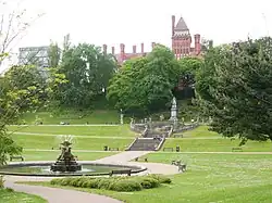 The park was designed and built in the 1860s and has matured over the last 140 years into one of the most attractive parks in the region. As an English Heritage Grade II* listed park,[1] it features a number of historical structures including a sundial, a grotto and a fountain. There is also an impressive statue of the 14th Earl of Derby who was British prime minister from 1866 to 1868.[2] The two parks are separated by the East Lancashire Railway embankment and access is through the Ivy Bridge and along Riverside Walk. The East Lancashire Railway line closed in the 1970s although the viaduct across the river, which is a Grade II listed building, remains, as it carries a public footpath across the river. The west edge of the park is bounded by the embankment carrying Preston's main rail link, the West Coast Main Line.