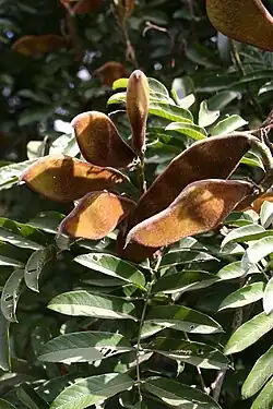 A semi-deciduous tree from 10 – 25 m tall. The stem is usually twisted or bent and often branches low down. The bark is smooth on younger branches and flaky on older branches and stems. The colour of the bark is pale brown to pale grey-brown,[2] with some stems appearing reddish where stained by soil from termites. The compound leaves have 3 to 7 pairs of opposite, lance-shaped leaflets and one terminal leaflet. The leaflets are 20 – 50 mm long and the leaves are up to 250 mm long overall. The leaves are glossy dark green or blue-green above, and yellow-green beneath. Fine silky hairs are present on the undersides of the leaves and on the midrib. Older leaves turn yellow and these trees lose most of their leaves in the drier months (winter), but they are soon replaced by new leaves which are reddish-brown and velvety at first. The flowers are similar to those of wisteria, and are described as mauve, lilac or purple in colour. The fruits are flat, woody pods up to 150 x 40mm and covered with a velvety layer of reddish to golden brown hairs. The pods split (often with a loud popping noise) when dry to release flat, oblong seeds which are easy to grow in fine sandy soil.[3]