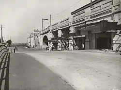 The Milsons Point station was constructed between 1929 and 1932 as part of the northern approaches. It was initially called Kirribilli Station, but was changed to Milsons Point before its opening. By June 1931 the station platform had been completed and a portion of the platform awnings had also been erected. The railway decking had advanced as far as Milsons Point, tracks had begun to be laid and the transoms delivered for installation. By January 1932 the platforms had been covered with asphalt, the brickwork of the shops in the arcade below the station was completed as was the tiling, the laying of magnesite flooring in the station office, terrazzo flooring in the lavatories, the erection of the metal awnings at the Alfred Street and Broughton Street entrances, terracotta facing to the station and installation of gates and barriers. Trackwork was completed and ballast laid along the tracks at the same time.[3]