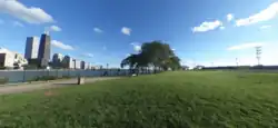 Open space at Milton Lee Olive Park, with a view of the Chicago skyline along Lake Michigan