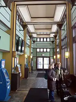 The 1,600-square-foot (150 m2) station includes a Quik-Trak ticket machine, restrooms, a seating area, and covered walkways to both the drive-up area and the boarding platform.[4][5] As the station is unstaffed, all tickets from the station need to be purchased online, from the Quik-Trak machine or on the train from a conductor. Passengers needing checked baggage service are advised to use the downtown station.[6] The station parking lot contains 300 spaces and a fee is charged to park.[7] All revenue generated from parking fees is used to finance the station's operating costs.[6] Transport to and from the airport terminal is provided by the free shuttle buses operated by the airport.[6]