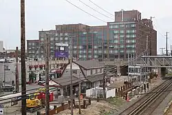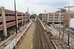 The construction of a new parking structure at Harrison Avenue began in fall 2018,[16][18] followed by the start of reconstruction on the station itself in early 2019.[16][17] The Second Street parking lot would also be expanded,[19] and a park and ride parking lot at Main Street would be built.[20] The dangerous grade crossing at Main Street was closed and replaced with a pedestrian overpass with two elevators.[21] Additionally, the grade crossing at Willis Avenue further east of the station was eliminated and replaced with an underpass.[22] The construction of the third track also required the replacement of a substation at the intersection of Main and Front Streets.[23]