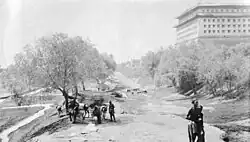 Beijing's inner city wall was built during the Ming Dynasty in 1419.[1] The Ming city walls stood for nearly 550 years until the early 1960s when most of the gates and walls were torn down to build the Beijing Subway, which runs underneath where the walls stood. The subway's inner loop line turned into the Inner City at Chongwenmen to stop at the Beijing railway station, and did not need to run beneath a section of the wall at the southeast corner of the Inner City. Of the 40 km of the original wall, only this 1.5 km section was spared. Inside this section of the wall (north of the wall) are railway yards of Beijing Station. Outside the wall (south of the wall) stood residential homes and small businesses.