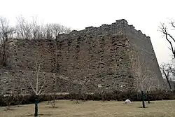 The inner city wall stood 11.4 m (37 ft) high and were topped with battlements that rose a further 1.9 m (6.2 ft).[11] The wall, lined with brick and filled with rammed earth, was 19.8 m (65 ft) thick at the foundation and 16 m (52 ft) at the top.[11] Bastions protruding on the outside face of the wall are locally known as mamian or "horse face". The bastions, spaced about 80 m (260 ft) apart, allowed archers to fire at attackers from three sides.[8] The restored fortification has 11 bastions on the southern wall and two bastions on the shorter eastern wall. Only the battlements of the corner tower and one bastion has been fully restored.