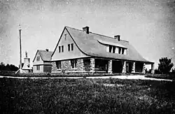 In addition to the barns and greenhouses, Covenhoven was supported by numerous outbuildings, including a windmill, a gas house, a carriage house, and a gardener's cottage. At the southern tip of the island, Van Horne constructed a bathhouse: a perfectly round, two-level building, the upper level offering panoramic views of the bay while the lower level contained changing rooms and provided access to the beach, and the family's in-ground tidal swimming pool.