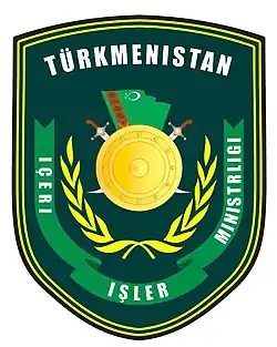 The Ministry of Internal Affairs (Turkmen: Türkmenistanyň Içeri Işler Ministrligi) is the interior ministry or national police force of Turkmenistan. The ministry directly controls the Turkmen police force, consisting of about 25,000 personnel and works with the Ministry for National Security on matters of law enforcement and national defense.[1] The primary tasks of the police force include maintaining law and public security, crime prevention and investigation, passport controlroad and fire safety, and international cooperation in law enforcement. The ministry works with INTERPOL.[2] The current minister is Muhammet Hydyrow. The ministry was founded on February 19, 1998, by decree of President Saparmurat Niyazov “On the formation of the police of Turkmenistan”.