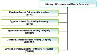 The petroleum sector in Egypt consists of 6 state-owned entities. These are: Egyptian General Petroleum Corporation (EGPC), Egyptian Natural Gas Holding Company(EGAS), Egyptian Petrochemicals Holding Company (ECHEM), Ganoub El Wadi Petroleum Holding Company (GANOPE), and Egyptian General Authority for Mineral Resources.