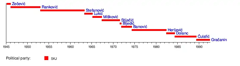 The Ministry of the Interior of Yugoslavia refers to the internal affairs ministry which was responsible for interior of the Kingdom of Yugoslavia from 1918 to 1945 and the communist SFR Yugoslavia from 1945 to 1992. It may also refer to the interior ministry of Serbia and Montenegro (officially named the Federal Republic of Yugoslavia) from 1992 to 2003.