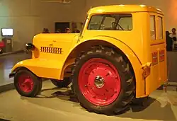 Minneapolis-Moline pioneered the concept of the closed-cab farm tractor in 1938 by developing the UDLX Comfortractor (also known as the Model U Deluxe).[4] The UDLX had flowing enclosing bodywork and a well appointed all-weather cabin, which contained a passenger seat, the idea being that the farmer and his wife would ride in comfort.[5] Entry to the cabin was by a large rear door. The bodywork was painted in as the bright "Prairie-Gold" colour while the bumper and hubcabs were chromed.[5] It was equipped with automotive features such as safety glass windscreen, windshield wipers, an electric starter and a dashboard with a speedometer, clock, sun visor, rear view mirror, plus several firsts in a tractor, including a heater, a cigarette lighter, ashtray, and a radio.[4]