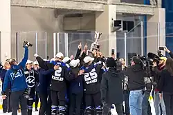 On August 21, the Whitecaps unveiled their new logo.[30] During their first NWHL season, league commissioner Dani Rylan stated that the Whitecaps were the first team in the league to turn a profit by having a league-leading 500 season tickets sold, significant merchandise sales, and all home games sold out through eight games.[31] On March 3, 2019, the Whitecaps finished their inaugural NWHL season as the first seed and regular season champions.[32] On March 17, 2019, the Whitecaps beat the Buffalo Beauts 2–1 in overtime to win the Isobel Cup league playoff championship. The Whitecaps also ended the season with the highest average attendance by selling out all ten home games including the playoffs.[33]
