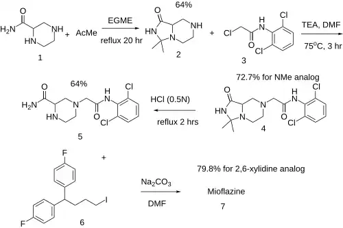 The first step involves reacting Piperazine-2-carboxamide [84501-64-4] (1) with acetone to form a cyclic aminal protecting group thus forming hexahydro-3,3-dimethylimidazo(1,5-a)pyrazin-1(5H)-one [83898-63-9] (2). The vacant piperazine secondary nitrogen is reacted with 2-Chloro-N-(2,6-dichlorophenyl)acetamide [3644-56-2] (3) giving N-(2,6-dichlorophenyl)hexahydro-3,3-dimethyl-1-oxoimidazo[1,5-a]pyrazine-7(1H)-acetamide [83898-62-8] (4). Acid hydrolysis removal of the cyclic aminal protecting group gives 3-Carbamoyl-N-(2,6-dichlorophenyl)piperazine-1-acetamide [83863-78-9] (5). The unmasked remaining piperazine secondary nitrogen is alkylated with 1,1'-(4-Iodobutylidene)bis(4-fluorobenzene) [51787-79-2] (6), completing the synthesis of mioflazine (7).