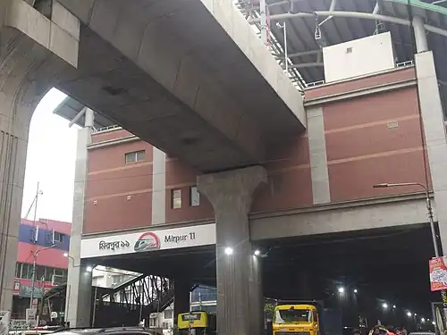 Mirpur 11 (Bengali: মিরপুর ১১, romanised: Mirpur egaro) is an elevated metro station of the Dhaka Metro's MRT Line 6. This station is located in Mirpur, a neighbourhood of Dhaka, Bangladesh. The station commenced operation from 15 March 2023.[2]