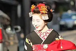The wareshinobu is a traditional hairstyle worn by junior maiko. A bun is made by inserting two lengths of padded red silk, and is then decorated with a large, short-pronged hair pin known as a kanokodome in the centre of the bun. For misedashi, apprentices wear formal hair ornaments made out of tortoiseshell, silver and red miokuri, and two bira-bira kanzashi.
