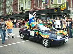 ![]() Miss Foozie rides in the back of a car during the 2010 pride parade in Chicago, Illinois.[1] | |