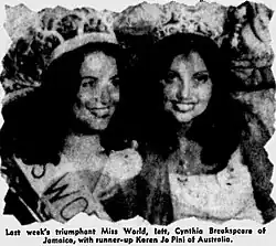 Miss World 1976 was the 26th edition of the Miss World pageant, held on 18 November 1976 at the Royal Albert Hall in London, United Kingdom. The winner was Cindy Breakspeare[2] from Jamaica.[1][3] She was crowned by Miss World 1975, Wilnelia Merced of Puerto Rico. Runner-up was Karen Jo Pini representing Australia, third was Diana Marie Roberts Duenas from Guam, fourth was Carol Jean Grant of United Kingdom, and fifth was Merja Helena Tammi from Finland.